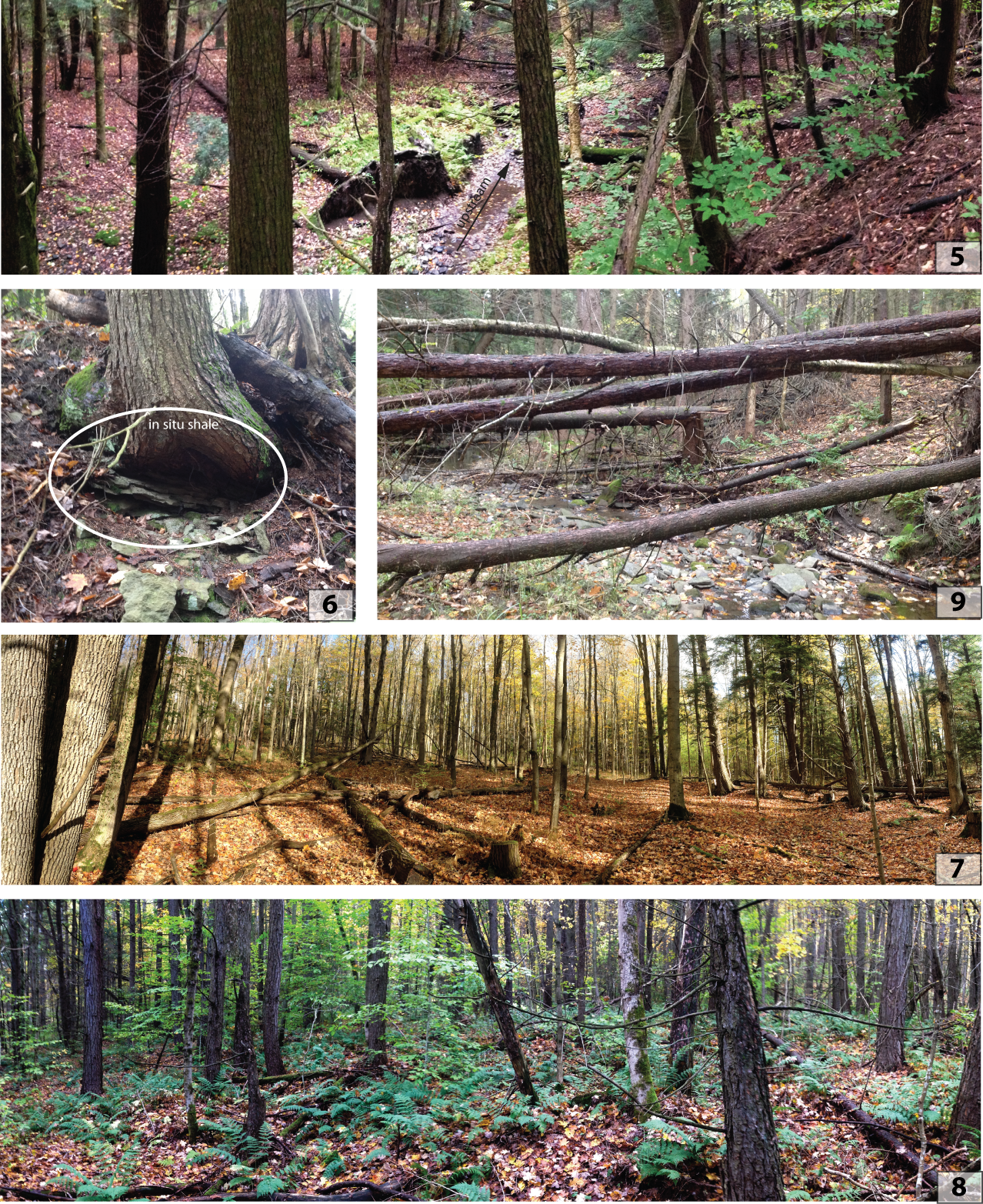 The stream beds were covered in pieces of shale, and in some places they were even imbricated. My interpretation was that these shale pieces were once part of the bedrock but they've been broken up and moved by streams, particularly during spring runoff. Over time, this process widened the valley upstream (see figure below). Downstream, the valley narrows, interpreted to be caused by incision of a more resistant rock than the shales upstream (although not confirmed because the edge of my study area was also the border of the state forest and I didn't want to go onto private land during hunting season). This produced the ridges/terraces observed at the south end of the study area.